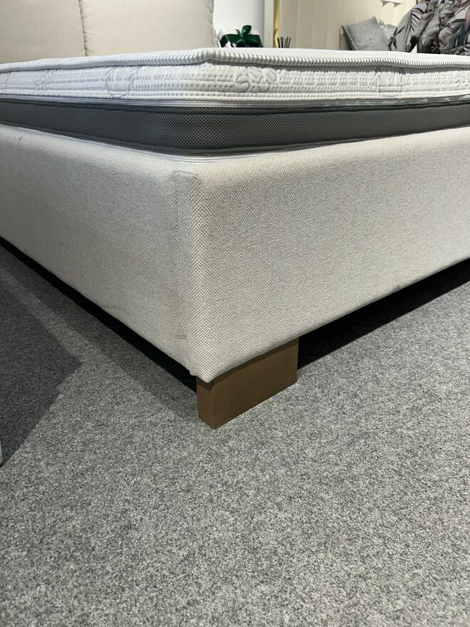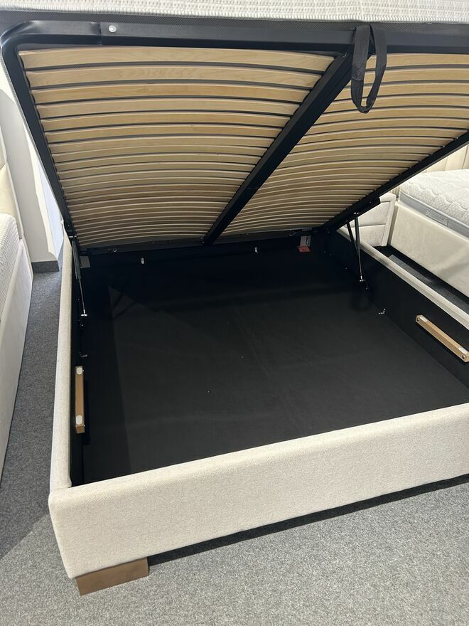 Łóżko wykonane jest w beżowej tkaninie z właściwościami ułatwiającymi czyszczenie