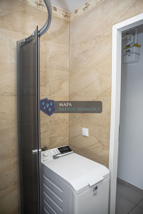 Łazienka: Funkcjonalna, z prysznicem oraz toaletą, pralka.
