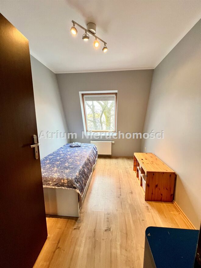 Drugi pokój: Przytulny pokój z pojedynczym łóżkiem i szafą, który doskonale sprawdzi się jako pokój dziecięcy lub gabinet.