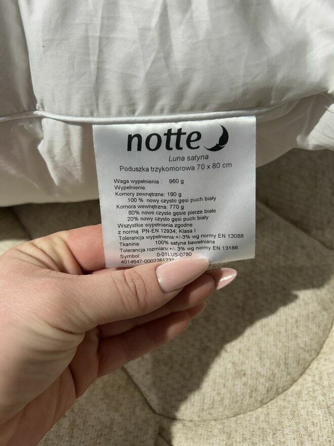 Wypełnienie: Komory zewnętrzne: 100% naturalny nowy puch gęsi - sprężystość 800 cu.in. Komora wewnętrzna: naturalny nowy półpuch gęsi.