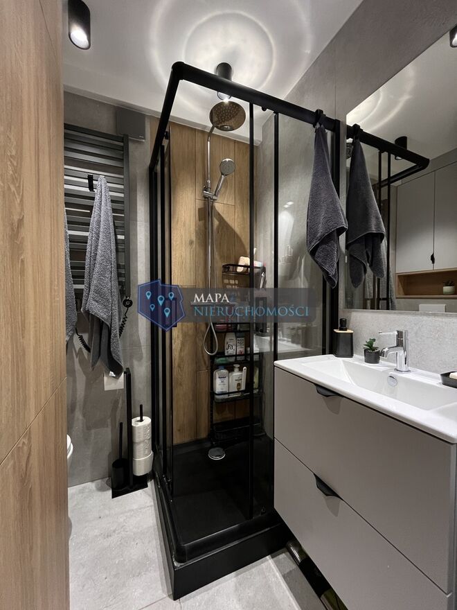 Łazienka po remoncie, z kabiną prysznicową w loftowym stylu oraz