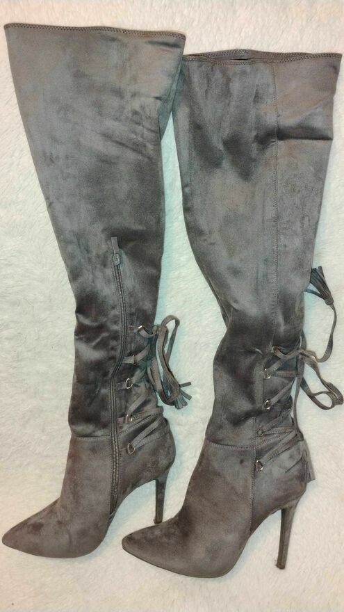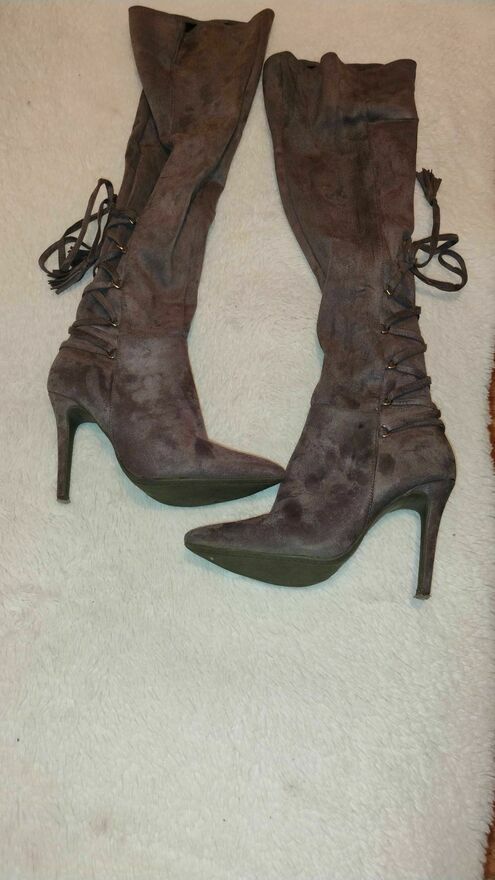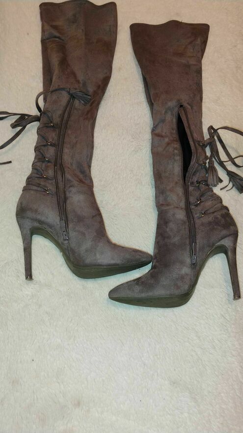 Kozaczki damskie za kolano VICES w kolorze brązowym zrobione z zamszu. Idealne na chłodniejsze dni, dodadzą charakteru każdej stylizacji. Od stopy-pięty do powyżej kolana - dł. ok. 55cm. Bardzo ładne.Ewa